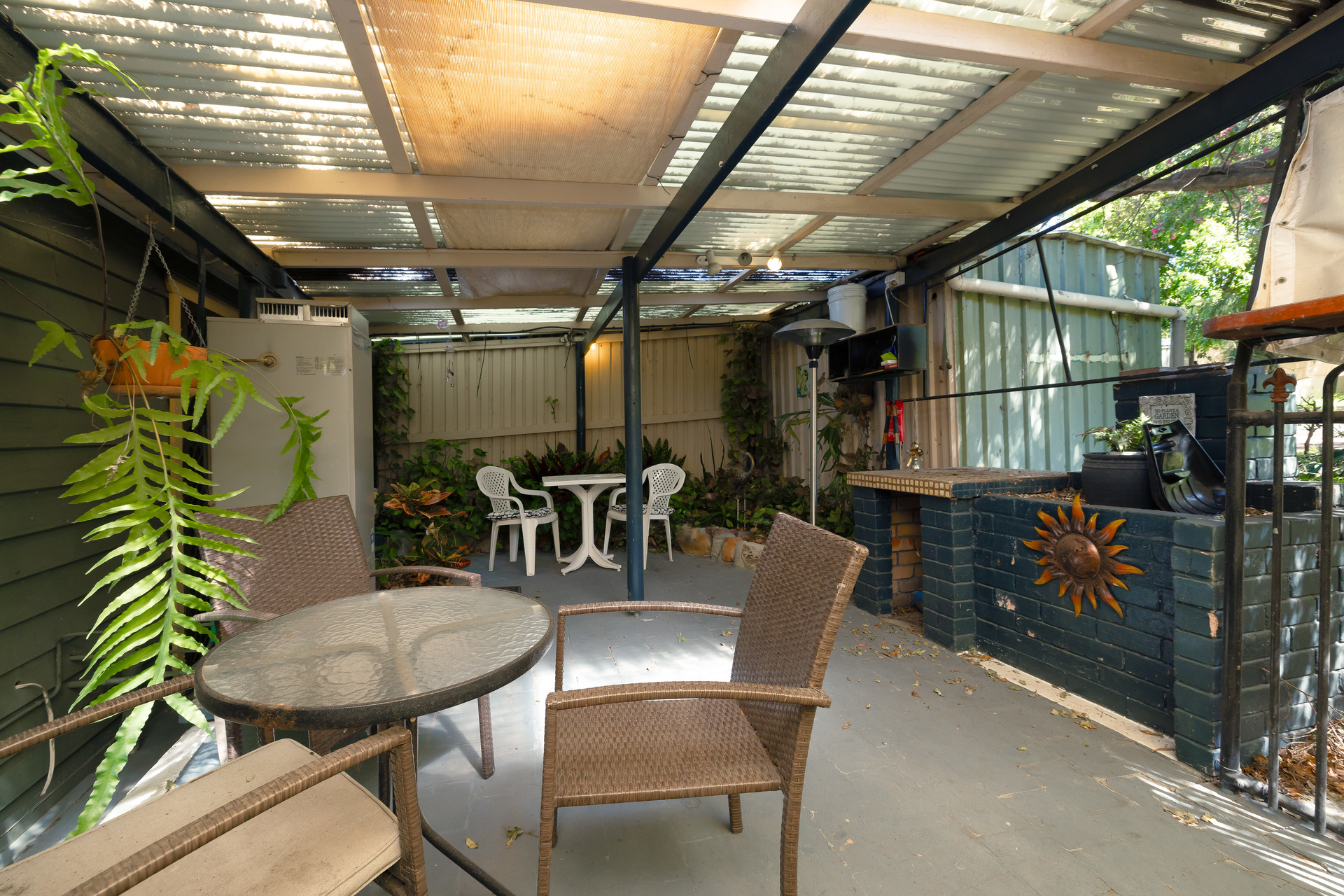 The accommodation comprises a Queen-sized bedroom fitted with a walk-in wardrobe. The bathroom is in keeping with the cottage feel of the property with a combined shower ub and good storage. An additional study nook provides a private area for those who work from home. Entertain or relax outdoors with a covered alfresco terrace with a built-in barbecue. The sprawling garden includes an aviary and vegetable planter boxes. There is potential to add a swimming pool, STCA. The single carport also offers an additional workshop area.