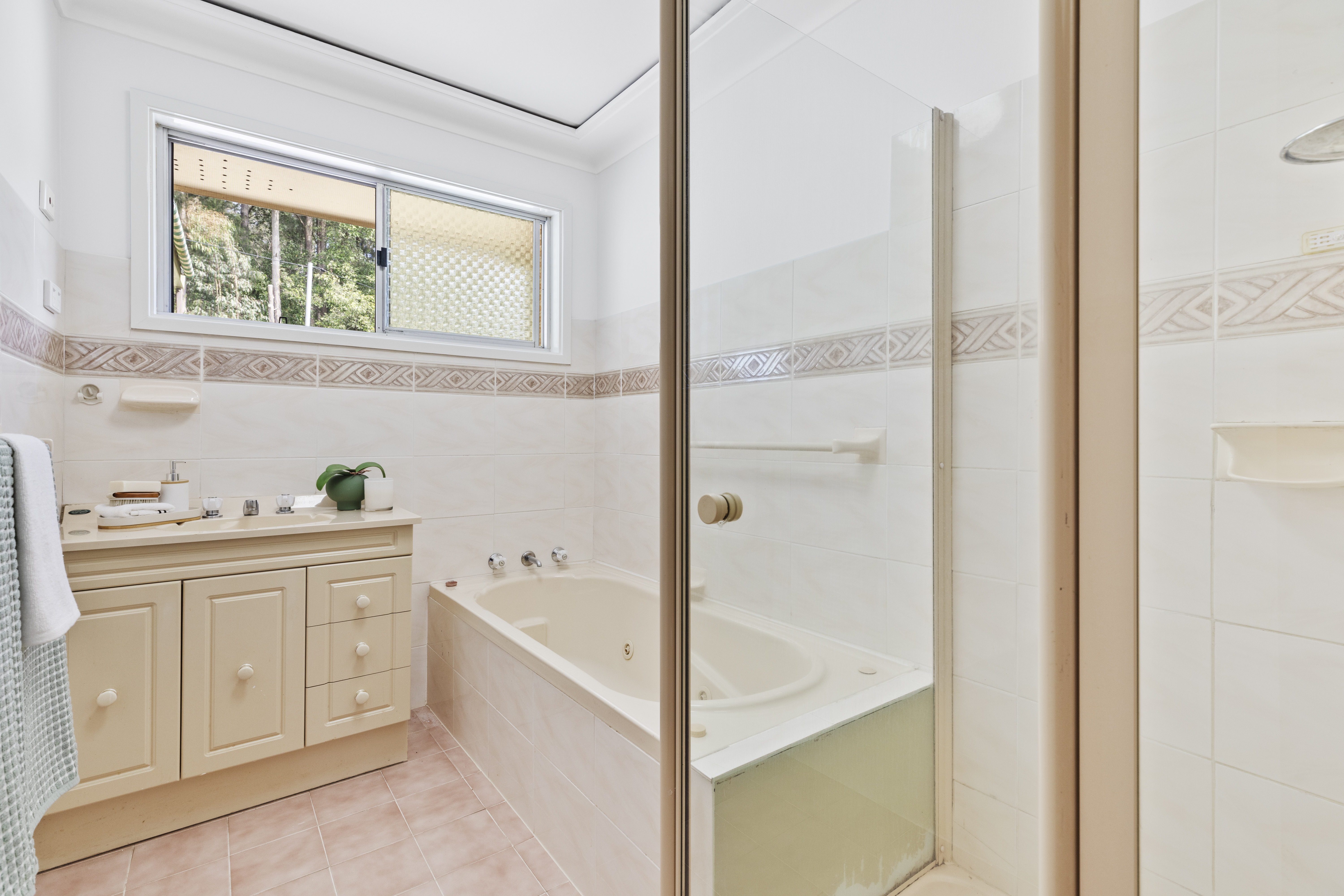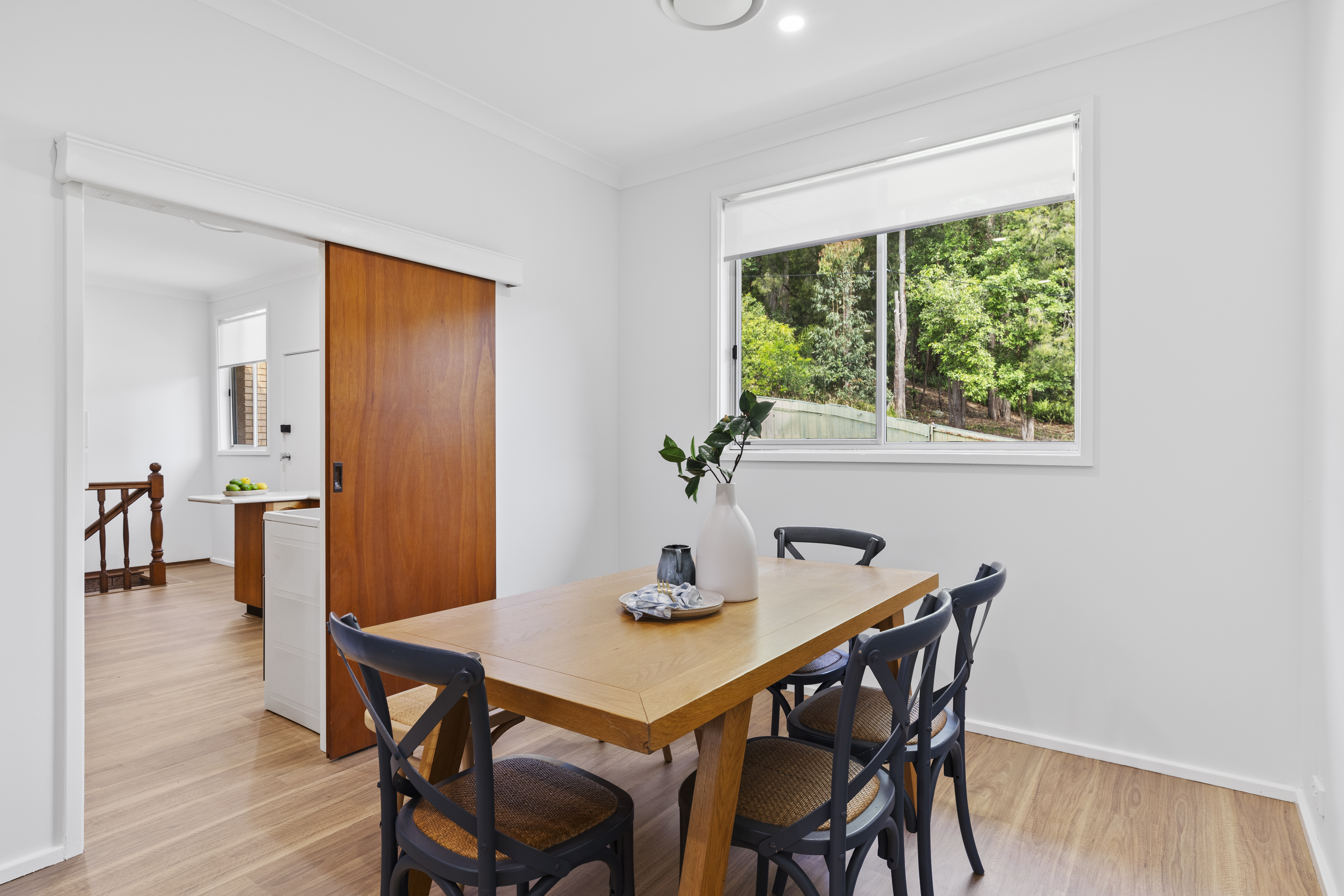 The main accommodation is perched above the double garage, which also houses a workshop plus an air-conditioned rumpus or potential fourth bedroom—offering flexibility depending on your needs. Upstairs, you’ll find an open-plan layout featuring timber-look flooring and ducted air-conditioning throughout for year-round comfort. Glass sliding doors lead to the north-facing verandah, perfect for soaking in the winter sun and enjoying the surrounding greenery. While the home is ready to enjoy as is, there’s also potential to add your own modern touches if desired, though it’s certainly not necessary.