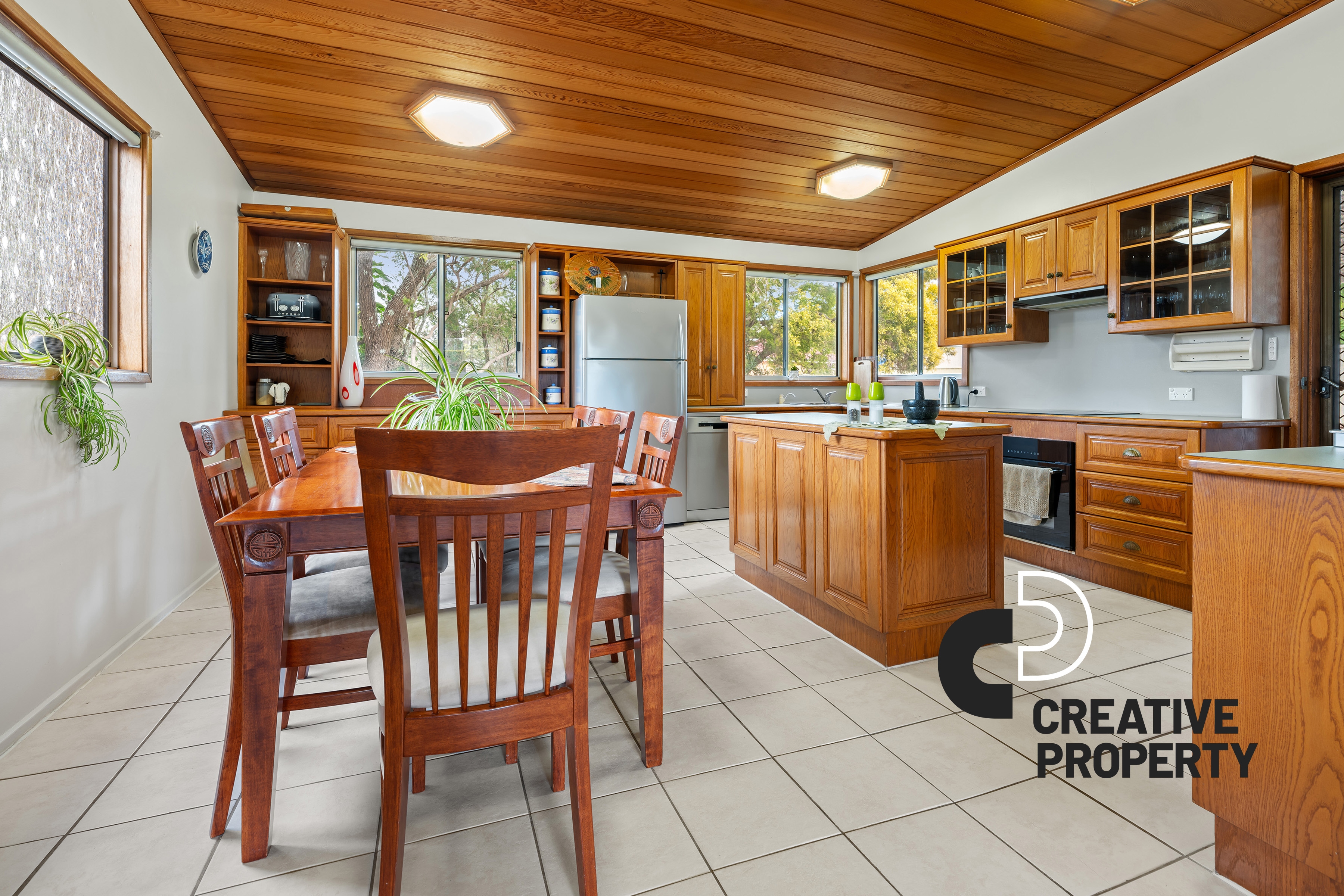 Upon entry, you'll be greeted by a generous open-plan layout on the lower level, effortlessly merging the kitchen, dining, and living areas. The sleek tiled flooring adds a modern touch, while the kitchen itself is a true standout, featuring ample cupboard space and a distinctive timber ceiling that brings warmth and charm to the space. A well-appointed bathroom on this level adds practicality, ideal for guests and busy family living alike.